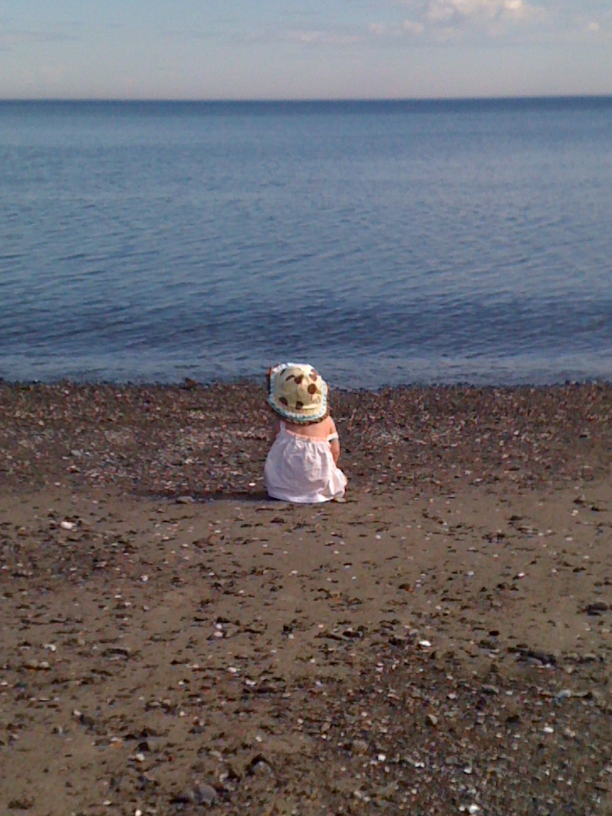 Roukie contemple la merÀ l’aube de ce petit départ, je nous revois l’année dernière nous arrêter fréquemment pour humer la mer et la contempler.  Marcher longuement sur les plages rocailleuses et faire les provisions d’air salin. Trier les coquillages.  Penser à tout et à rien.  Trouver pour chaque réponse une nouvelle question.